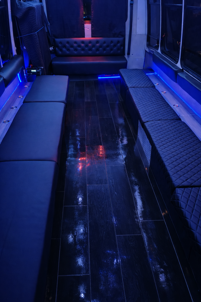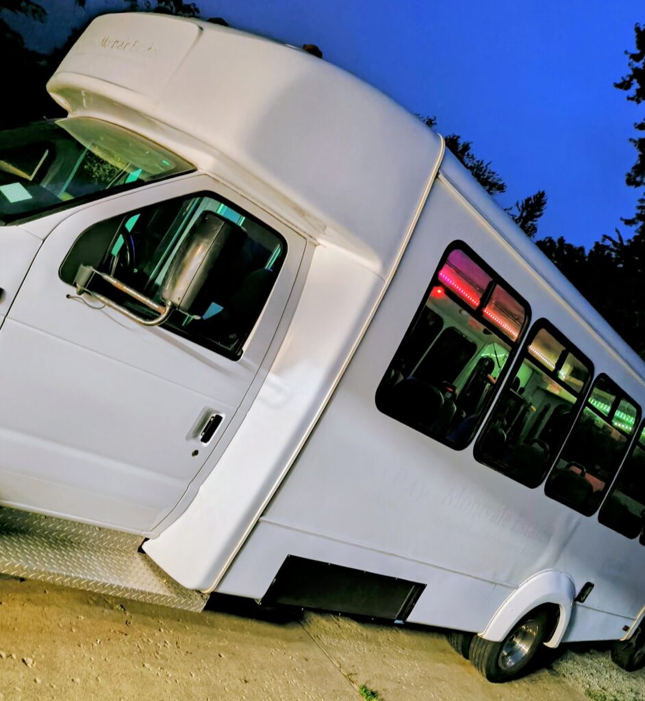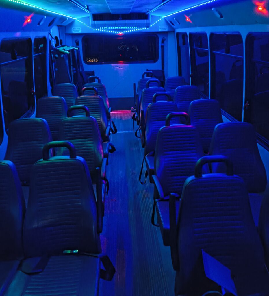 We’re here for all your party needs!! Weddings, Bachelorette, Bachelor parties, nights out on the town, Proms, or anything you can think of. Our bus is equipped with comfy leather interior, Bluetooth stereo system with speakers all around seating area., custom lighting adjustable with touchscreen, dimmable floor lighting, two built in coolers for ice and keeping drinks cold, two under seat heaters for those chilly nights, rear AC for keeping ya cool on those warm days and nights, blacked out blinds for privacy, privacy curtain from driver, under seating storage compartments. Licensed and insured for your safety.